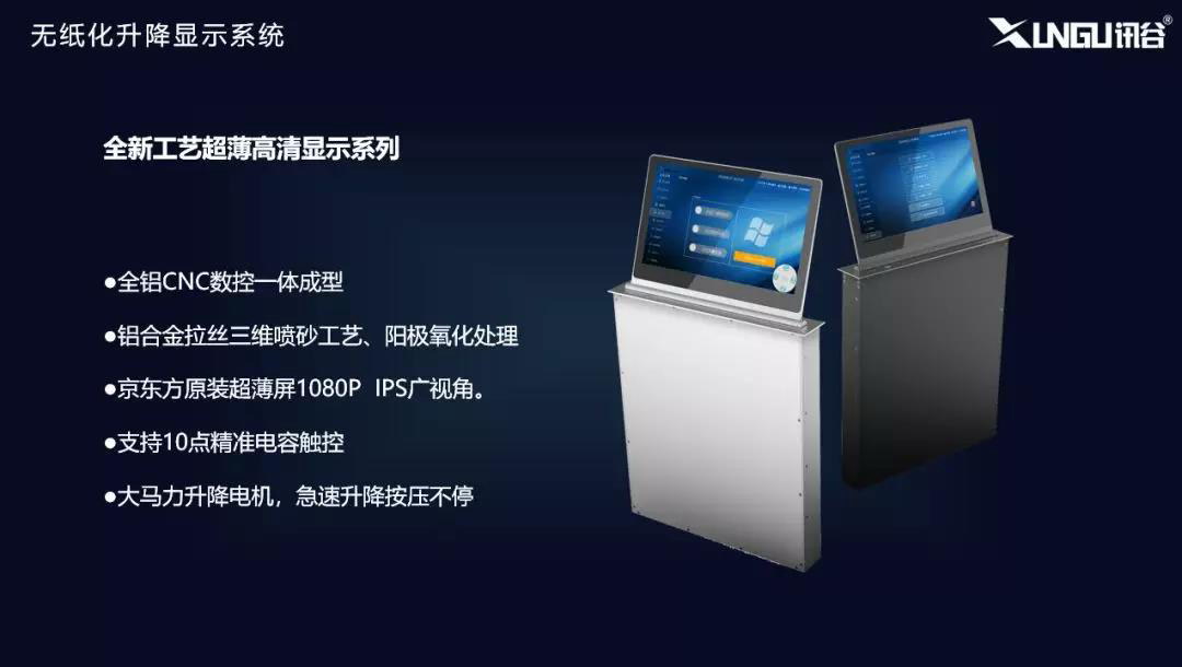 針對市場上無紙化升降存在的問題,訊谷升級生產工藝,打磨出全新高清超薄無紙化升降顯示器;得益于北京軟件研發團隊,創新性的在無紙化會議軟件中加入AI算法,讓訊谷無紙化軟件更加的高效智能。