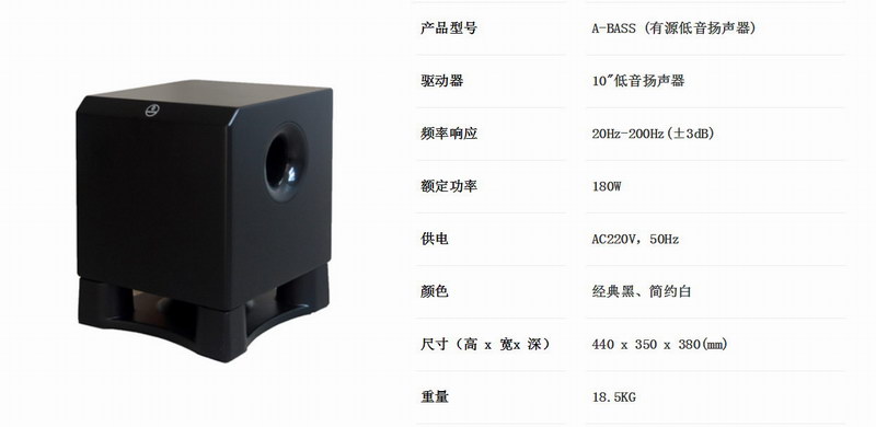 A-BASS是英嘉尼針對家庭影院、客廳影院、隱形影院、私家影院、背景音樂等場所而設計的一款10寸有源低音揚聲器,額定功率高達180W,只為締造澎湃低音。采用鋼琴烤漆工藝,耐磨耐臟,簡潔大方,質感十足,彰顯主人生活品味;玻璃鋼底座設計,結實堅固,有效防止共振干擾;下方低頻反射式設計,360度擴聲,無位置擺放限制;效率高、射程遠、低頻下限低至20Hz,人聲還原更真實,觀影K歌更震撼!