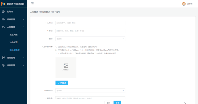 支持黑名單單個添加、編輯和導出操作;支持管理方預先在后臺上傳被列入黑名單的人員的照片,以及更豐富的個人信息,包括姓名、性別、年齡、手機號、身份證號碼、IC卡號、民族、籍貫、聯系地址、出生日期等。