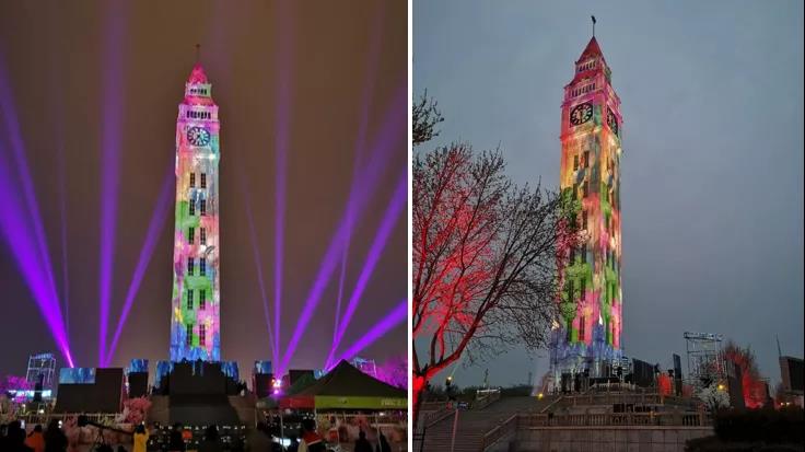 昵稱為“中國版大本鐘”的鶴壁鐘樓是鶴壁市地標之一。20 臺 Christie HS 系列 1DLP 激光投影機為鐘樓打造出絢麗的燈光秀演出,成為鶴壁市民夜晚打卡的熱門景點。這項工程由中清映業集團負責。燈光秀的高品質投影為中國中北部地區的大型文化活動立下了新標桿。