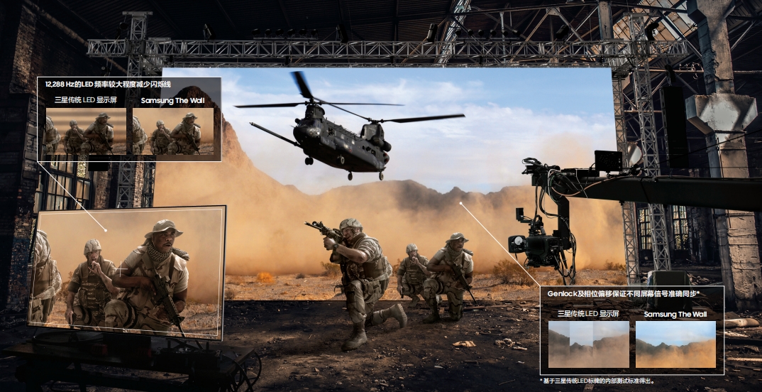 展會現場,微縮景觀營造出自然盛景,迷你小人穿梭于廣袤的草原與巍峨的高山間,在三星The Wall虛擬制作專用顯示屏打造的環繞包裹式場景下,一部旅行大片伴隨著徒步者的前行在即刻間完成拍攝,實現“所見即所得”。眾所周知,當使用攝像機在顯示器屏幕上拍攝影像時,會出現閃爍線,The Wall虛擬制作專用顯示屏擁有12,288 Hz的LED頻率,可有效減少閃爍線和偽影。此外,由于使用多臺設備,確保各畫面的信號與整個系統的信號同步非常重要。The Wall虛擬制作專用顯示屏具有Genlock和相位偏移功能,能有效避免丟幀或雙幀現象。該產品通過定向技術優化供了專業演播室設置所需的各項功能,為廣告與影視制作行業提供了高水準、高品質的虛擬拍攝空間,使角色完全融入環境,營造出高端質感。